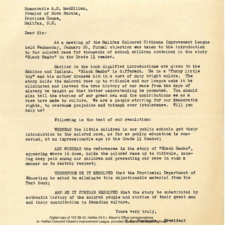 Le lendemain, un homme noir de la région écrit au premier ministre de la Nouvelle-Écosse, Alexander MacMillan, pour demander que Little Black Sambo soit retiré de la liste des manuels scolaires. Il veut que le texte soit remplacé par « les histoires de nos grands hommes et des contributions que notre race a apportées à la culture », avant de conclure par cette déclaration : « Nous sommes un peuple qui lutte pour ses droits démocratiques, pour surmonter les préjugés et triompher de l’intolérance. Nous aiderez-vous? »