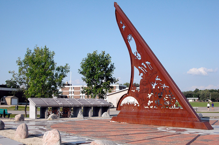 Construite dans le cadre d’un projet du Millénaire, cette oeuvre massive intègre douze thèmes liés au patrimoine, notamment les Premières nations, La Vérendrye et l’hydroélectricité.