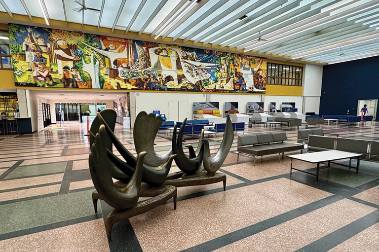 J’ai appris qu’il portait chance de frotter la tête des Birds of Welcome, une sculpture métallique de l’artiste Art Price. Et je suis encore en train de décrypter toute la symbolique de la fresque de 22 mètres de long de Kenneth Lochhead, Flight and Its Allegories, qui évoque nos sentiments à l’égard du vol.