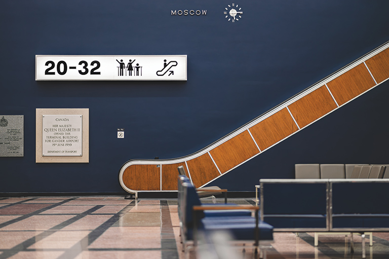 Cet aéroport stratégiquement situé, ouvert en 1938, était un aérodrome militaire pendant la Seconde Guerre mondiale et est devenu l’un des aéroports internationaux les plus fréquentés au monde dès les années 1950. Terre-Neuve a rejoint le Canada en 1949, et une décennie plus tard, la Reine a inauguré le nouveau terminal chic de Gander pour offrir, comme l’explique la signalétique de l’aéroport, aux riches et célèbres de ce monde « un accueil au Canada à la fois simple et luxueux » tout en proposant aux habitants « un aperçu du nouveau monde glamour du transport aérien transatlantique ».