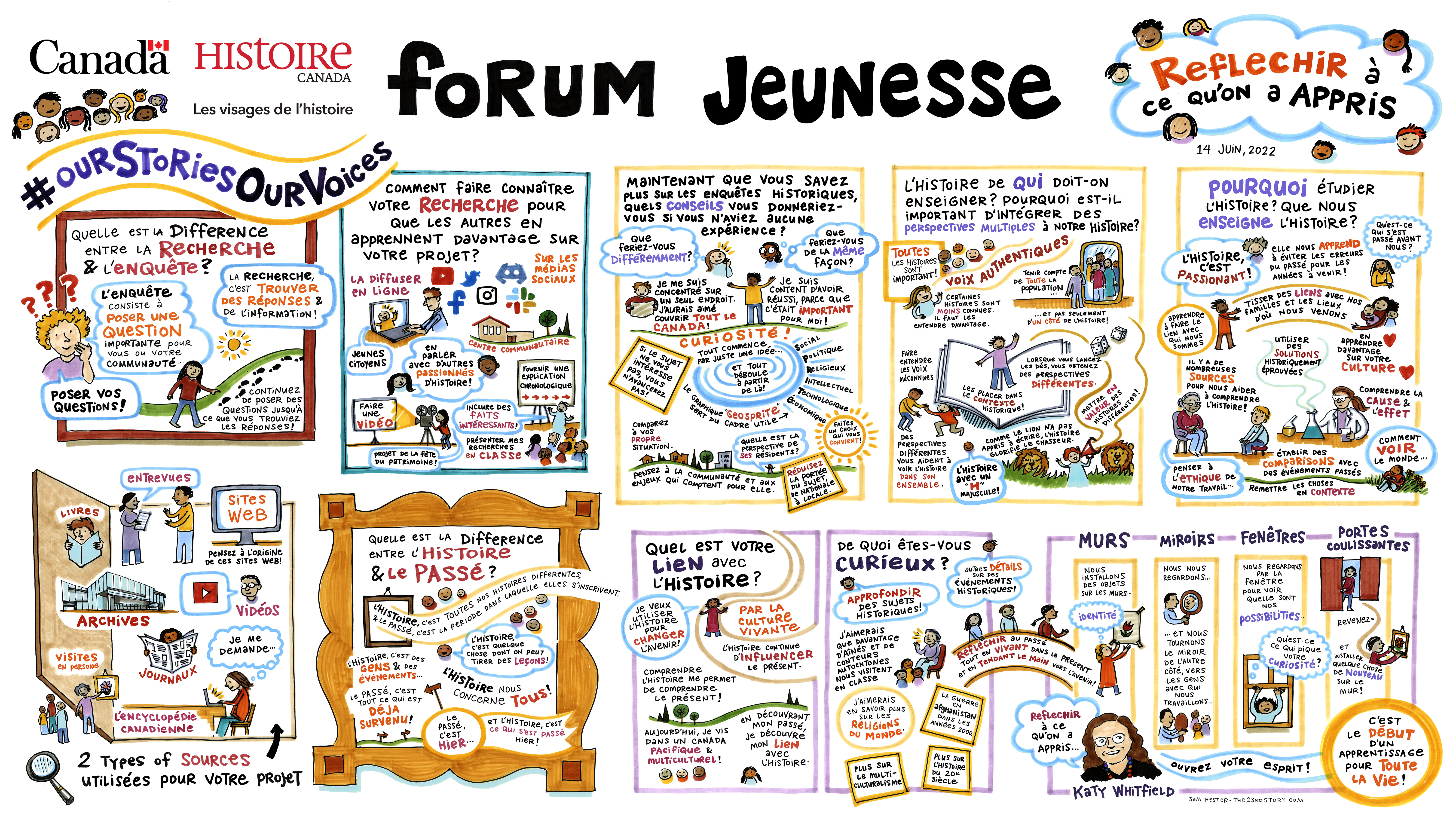 Installez l’affiche « Forum jeunesse de Histoire Canada : Réfléchir à ce qu’on a appris ». Demandez aux élèves de lire leurs réponses aux questions et de les comparer avec les réponses de l’affiche. Quelles réponses sont similaires? Quelles réponses sont différentes? Qu’ajouteriez-vous? Quelles autres questions devrait-on poser?