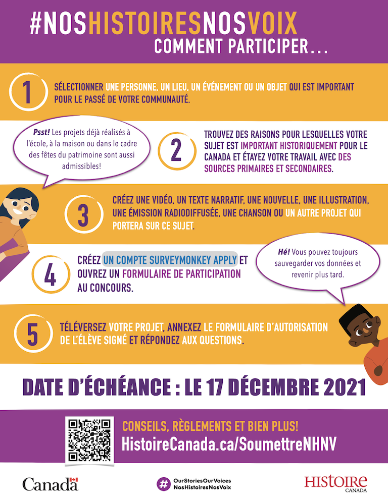 La Société Histoire Canada est fière de présenter #NosHistoiresNosVoix, un programme national pour les jeunes qui offre à des élèves âgés de 9 à 18 ans l’occasion d’explorer une histoire importante pour le passé de leur communauté et de faire connaître les gens, les lieux, les événements, et les objets qui font partie de notre passé diversifié.