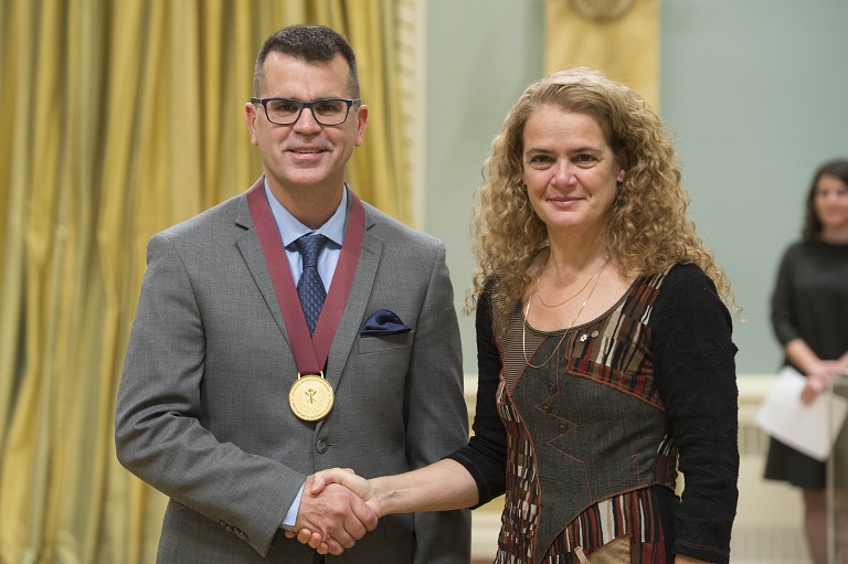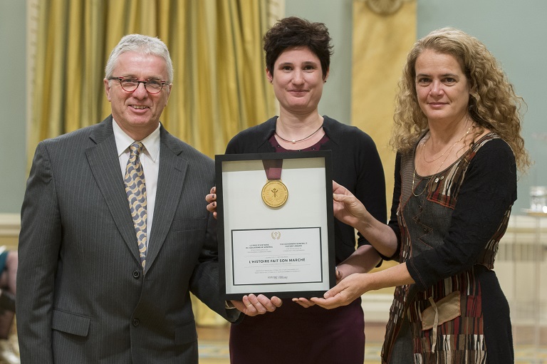 Son Excellence, la très honorable Julie Payette, remet le Prix de l'histoire du Gouverneur général pour l’excellence des programmes communautaires à Michel Harnois et Marie-Ève Gingras de la Société d’histoire de Sherbrooke.MCpl Vincent Carbonneau, Rideau Hall © OSGG, 2017. -