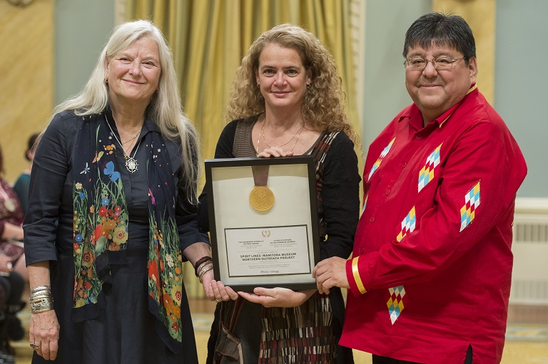 Son Excellence, la très honorable Julie Payette (au centre), avec Maureen Matthews (à gauche) et David Swanson (à droite), lauréats du Prix d'histoire du Gouverneur général pour l'excellence dans les musées: Le Prix Histoire vivante!MCpl Vincent Carbonneau, Rideau Hall © OSGG, 2017. -