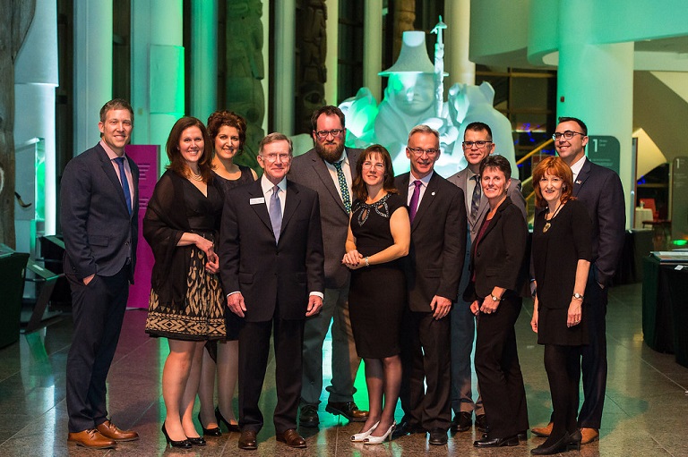 Sean Casey, secrétaire parlementaire de la ministre du Patrimoine canadien (cinquième à partir de la droite) avec David Ross, président du conseil d'administration de la Société Histoire Canada (quatrième à gauche) et Janet Walker, présidente et directrice générale de la Société Histoire Canada entourés des lauréats du Prix d'histoire du gouverneur général pour l'excellence en enseignement.Brittany Gawley -