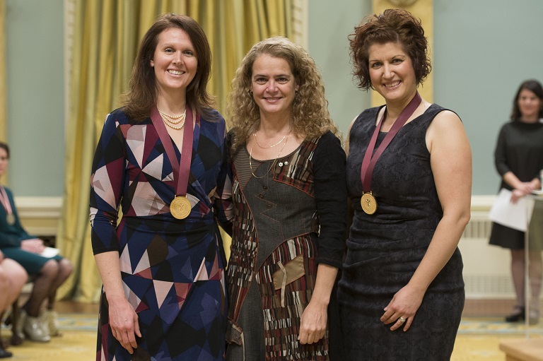 Son Excellence, la très honorable Julie Payette, Gouverneure générale du Canada (au centre), avec les lauréates Leia Laing (à gauche) et Naomi Fortier-Fréçon (à droite).MCpl Vincent Carbonneau, Rideau Hall © OSGG, 2017. -