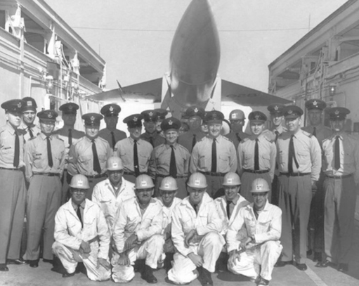 Des membres du 447e escadron de l’Aviation royale canadienne photographiés avec des missiles acheminés de La Macaza vers l’île Santa Rosa dans le golfe du Mexique pour une série d’essais.
