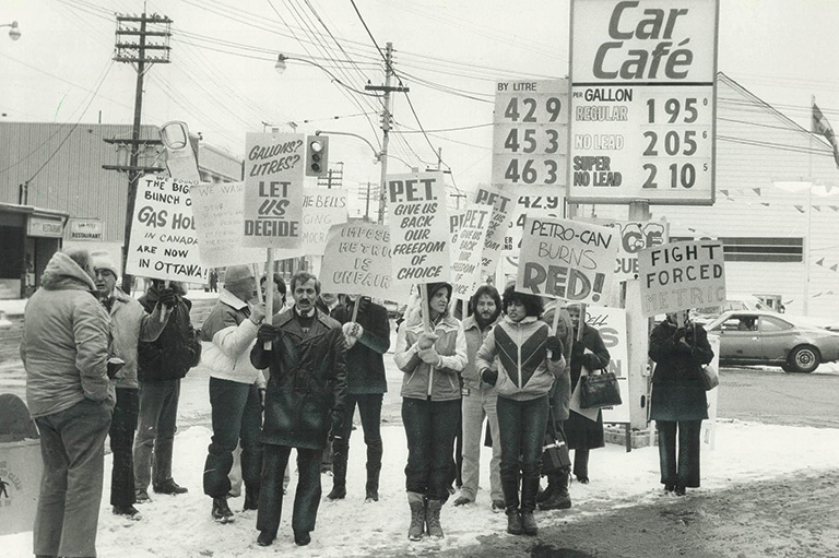 Le passage au système métrique se poursuivra pendant le reste de la décennie. En décembre 1977, les panneaux routiers adoptent le kilomètre pour indiquer la vitesse et la distance, tandis qu’en janvier 1979, les stations-service abandonnent le gallon au profit du litre. La conversion des balances des épiceries devient un enjeu politique, les dates butoir étant sans cesse repoussées jusqu’à ce qu’en décembre 1983, les magasins ne puissent plus vendre leurs produits qu’en grammes et en kilogrammes.