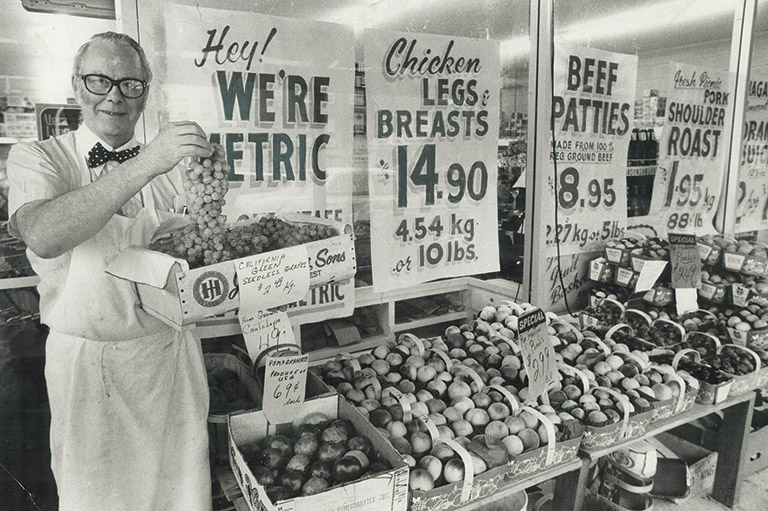 Le passage vers le système métrique ne sera pas soudain : il est reconnu comme « système de remplacement » en Amérique du Nord depuis le 19e siècle. Lorsque la Loi concernant les poids et mesures du Canada entre en vigueur en 1873, toutes les transactions en unités métriques sont immédiatement reconnues. Dans les années 1960, des associations professionnelles représentant des entreprises, des consommateurs, des enseignants, des scientifiques et d’autres intervenants font pression sur le gouvernement fédéral pour qu’il adopte le système métrique. Ses promoteurs avancent de nombreux arguments qui seront bientôt familiers, notamment la normalisation à l’échelle internationale, la simplicité des mesures basées sur des facteurs de 10 au lieu de valeurs de base aléatoires et la vente potentielle de produits canadiens sur un plus grand nombre de marchés.