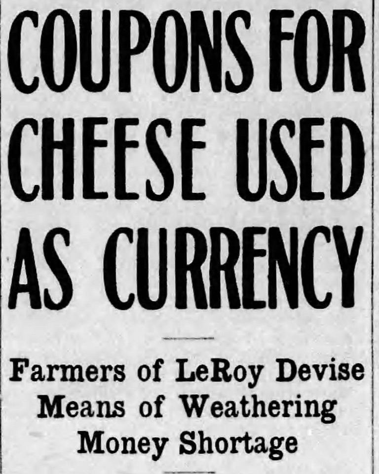 L’un des directeurs de l’association, Gordon B. Gregory, a une idée. Au lieu d’argent liquide, Gregory suggère que l’usine paie le lait à l’aide de coupons, des billets privés ou des bons qui pourraient être échangés contre de la monnaie ayant cours légal, mais seulement après la vente des premiers lots de fromage. En attendant, si les agriculteurs ont besoin d’argent plus rapidement, ils peuvent utiliser les bons de fromage pour acheter des produits alimentaires ou d’autres marchandises auprès des commerçants de la ville. Tous les commerçants de LeRoy acceptent, y compris le forgeron, le mécanicien du garage, les vendeurs de matériel agricole, et même l’hôtel et le café du coin. Comme tout le monde est d’accord, Gregory envoie rapidement une commande de cinq cents coupons à l’imprimeur le plus proche, qui arrivent juste à temps pour payer les premières livraisons de lait à l’usine.