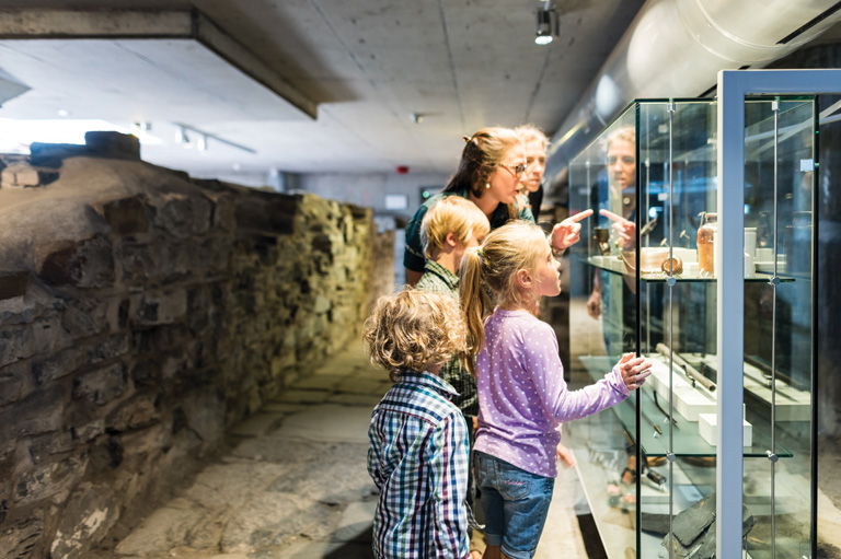 Des visiteurs découvrent des artefacts mis au jour lors des fouilles aux forts et châteaux Saint-Louis.Parcs Canada -