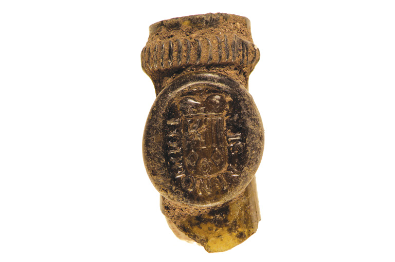 Un fragment d’une bouteille d’eau minérale Pouhon Spa de Belgique, trouvée lors des fouilles au fort Prince-de-Galles.Parcs Canada