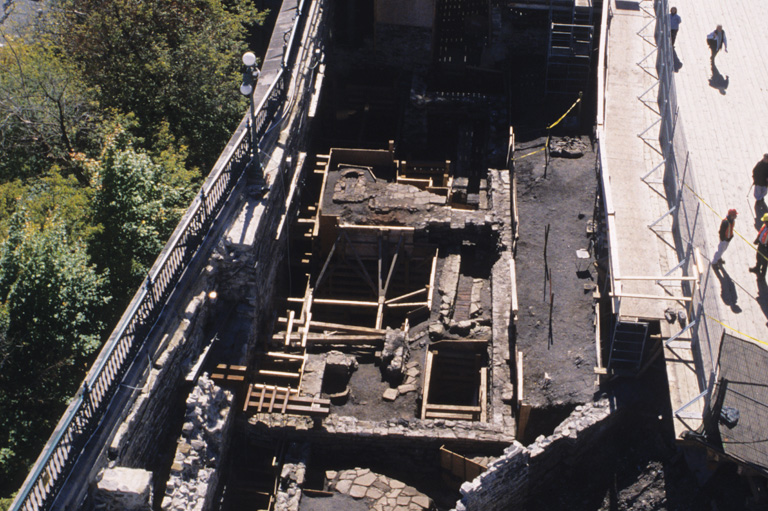 En retirant la plancher de la terrasse Dufferin, les fouilles archéologiques ont permis de retrouver les vestiges vestiges de bâtiments datant du début des années 1600. Ils sont mis en valeur au lieu historique national des Forts-et- Châteaux-Saint-Louis.Parcs Canada -