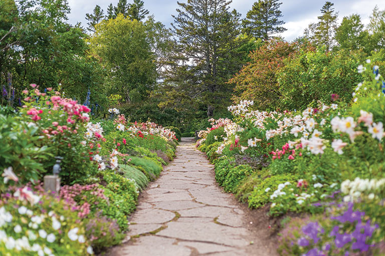 Des épinettes et des marronniers d’Inde bordent les limites extérieures des jardins, et toutes les nuances de vert, du vert lime pâle à l’émeraude foncé, semblent être représentées dans les feuilles et les buissons. Il règne un calme bienveillant lorsque l’on se promène dans les allées, où les zones ombragées offrent un moment de fraîcheur lors des journées ensoleillées. On imagine que Mme Reford serait ravie de voir ses jardins prospérer, avec de nombreux visiteurs explorant régulièrement cet espace fleuri près de 60 ans après sa mort, en 1967.