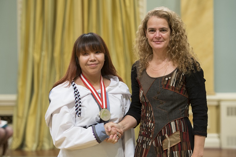Julie George (à gauche), lauréate du volet Arts et récits autochtones avec Son Excellence, la très honorable Julie Payette.MCpl Vincent Carbonneau, Rideau Hall © OSGG, 2017 -